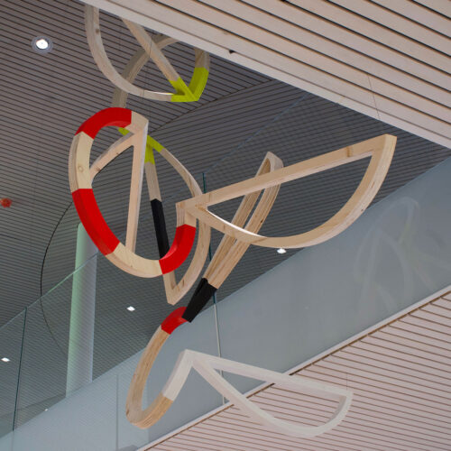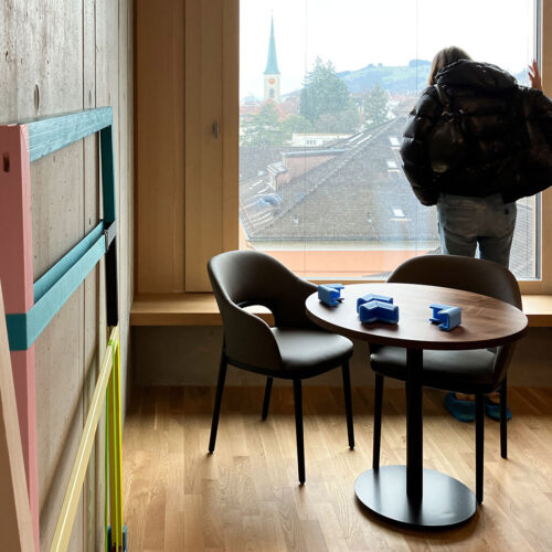 SUMSI Kunst am Bau Wettbewerb, Raiffeisenbank Au, Bregenzerwald Permanent Installation, 2024, Acrylic Paint on wood, 6 abstract objects, each 200 x…